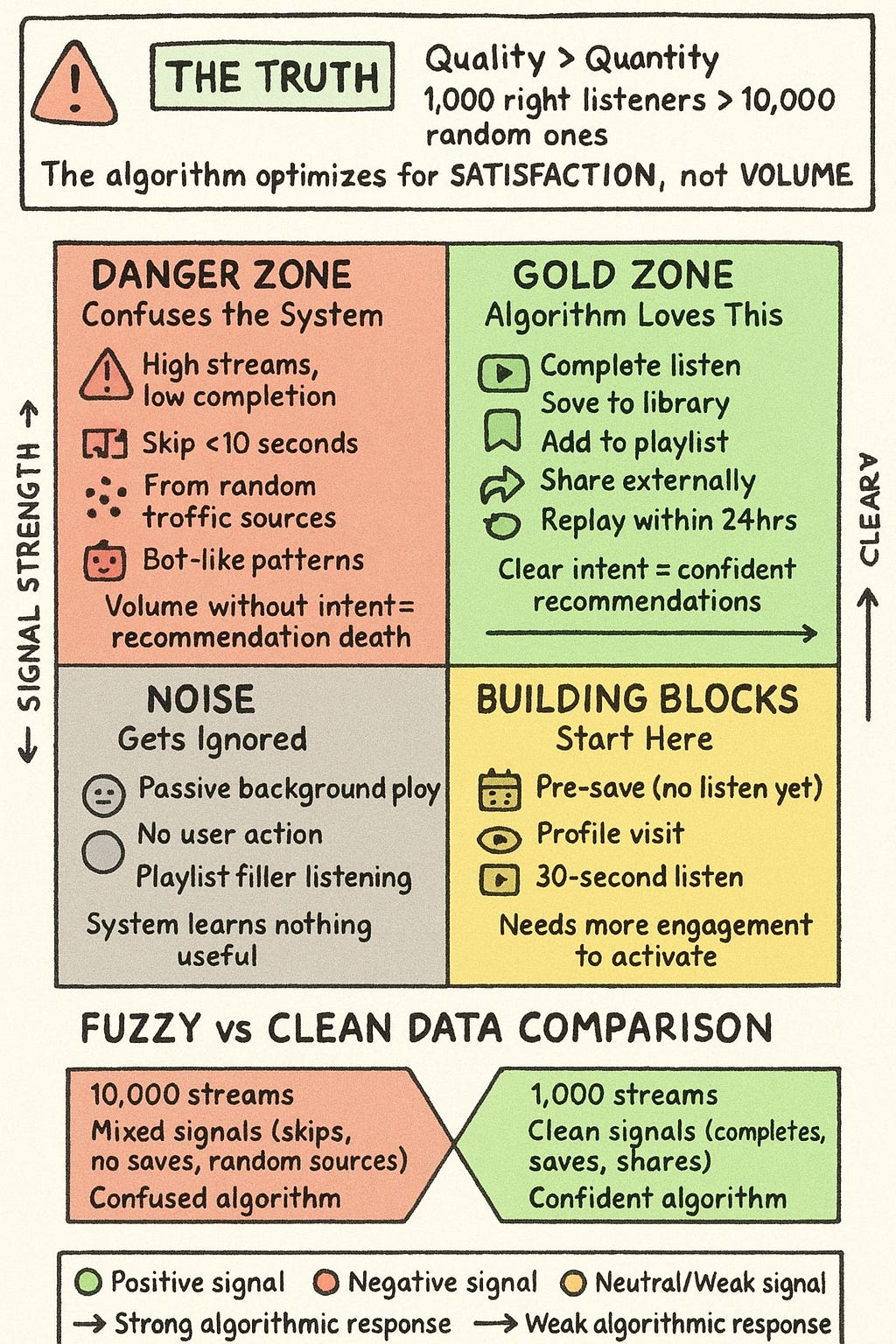 If your streams come from uninterested listeners—ads, pods, spammy playlists—you create fuzzy data.