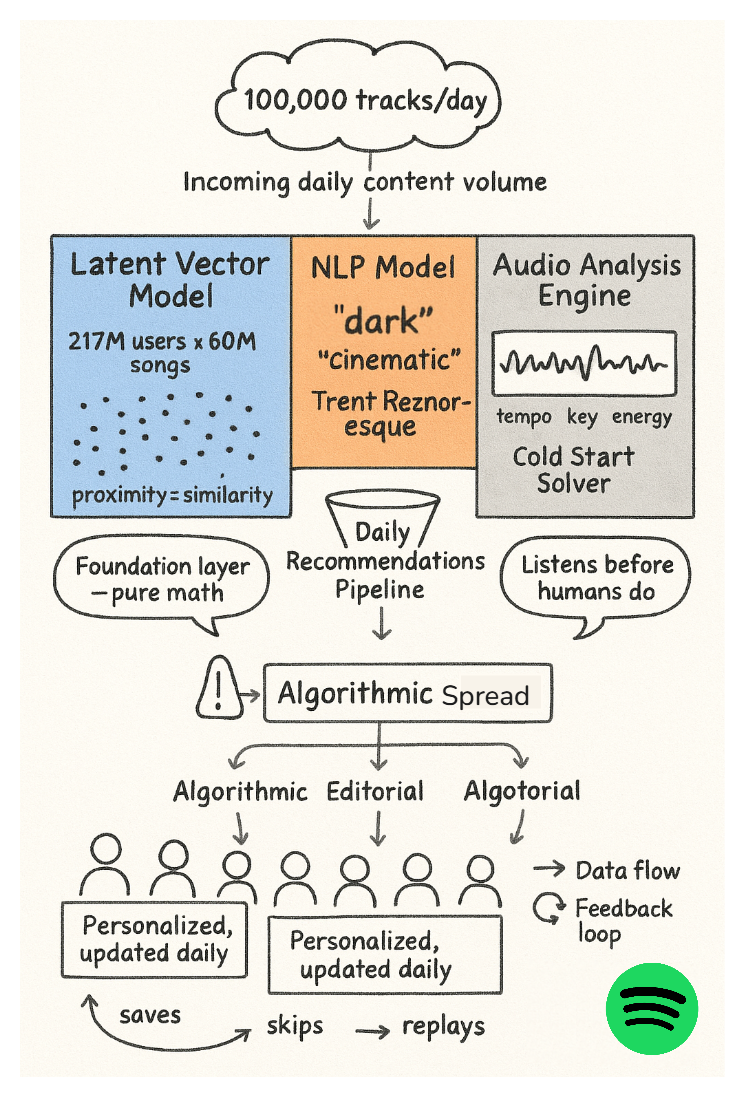 This powers Discover Weekly, Release Radar, Daily Mix—every personalized surface you see.